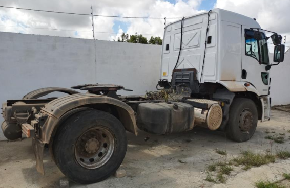 LOTE 62:. Veículo, cavalo mecânico, marca modelo Ford/Cargo 1933 - TL, ano e modelo de fabricação 2012/2013, placa PGA0786, de cor branca, sem a carroceria, com a parte externa dianteira desmontada, faltando a tampa do motor (capô), a bateria, a grade frontal, o retrovisor esquerdo, o farol superior esquerdo, a porta lateral esquerda, o parabrisas, a transmissão e parte do parachoque dianteiro, as rodas e o pneu externo direito, o pneu traseiro esquerdo interno. Faltando também o extintor, macaco, chave de rodas, triângulo, sistema de som, tapetes. Lanterna traseira esquerda quebrada.O interior do veículo está com diversas peças soltas. Avaliado em R$60.000,00 em 04/07/2025.