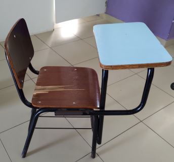 22 (vinte e duas) cadeiras infantis, com braço, em fórmica e metal, em bom estado de conservação; Uma mesa grande de escritório em mdf, acompanhada de tampo de vidro, em bom estado.